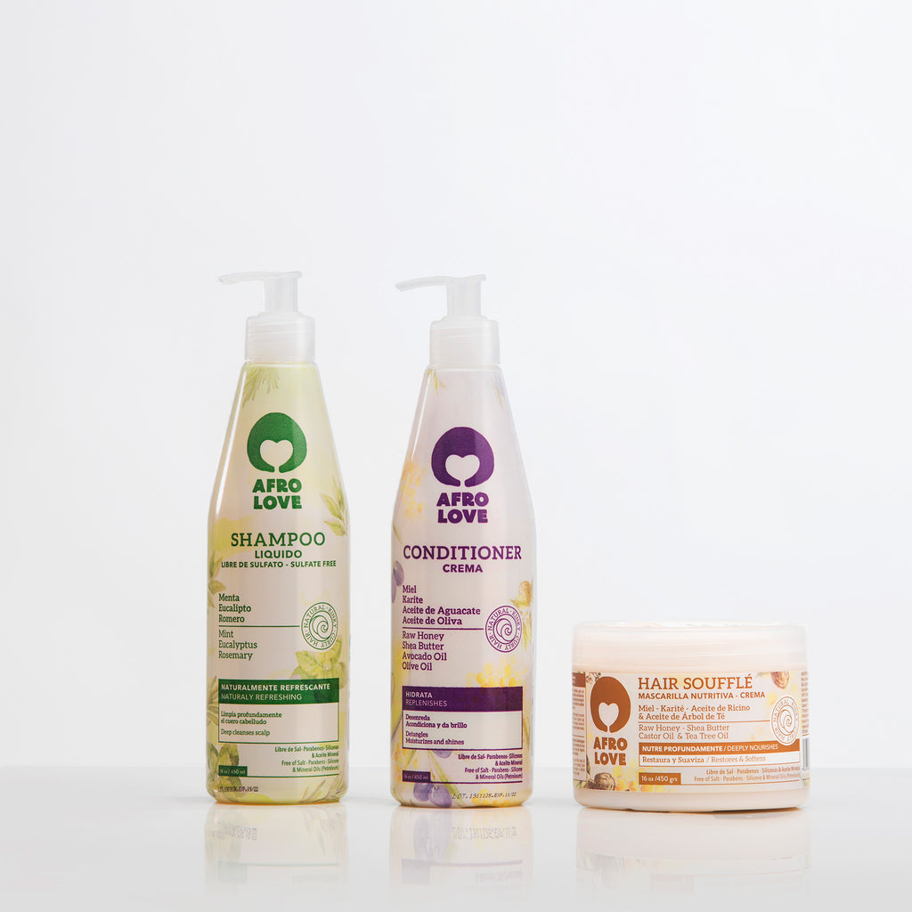 Afro Love es una línea capilar formulada libre de sales, sulfatos, parabenos, formol, dea, colorantes, aceites minerales y siliconas. Creada para cabellos naturales, afro o en transición. La línea conjuga una mezcla especial que estimula, refresca, hidrata, nutre y protege tu cabellera, aportándole brillo, definición y sedosidad a cada hebra.