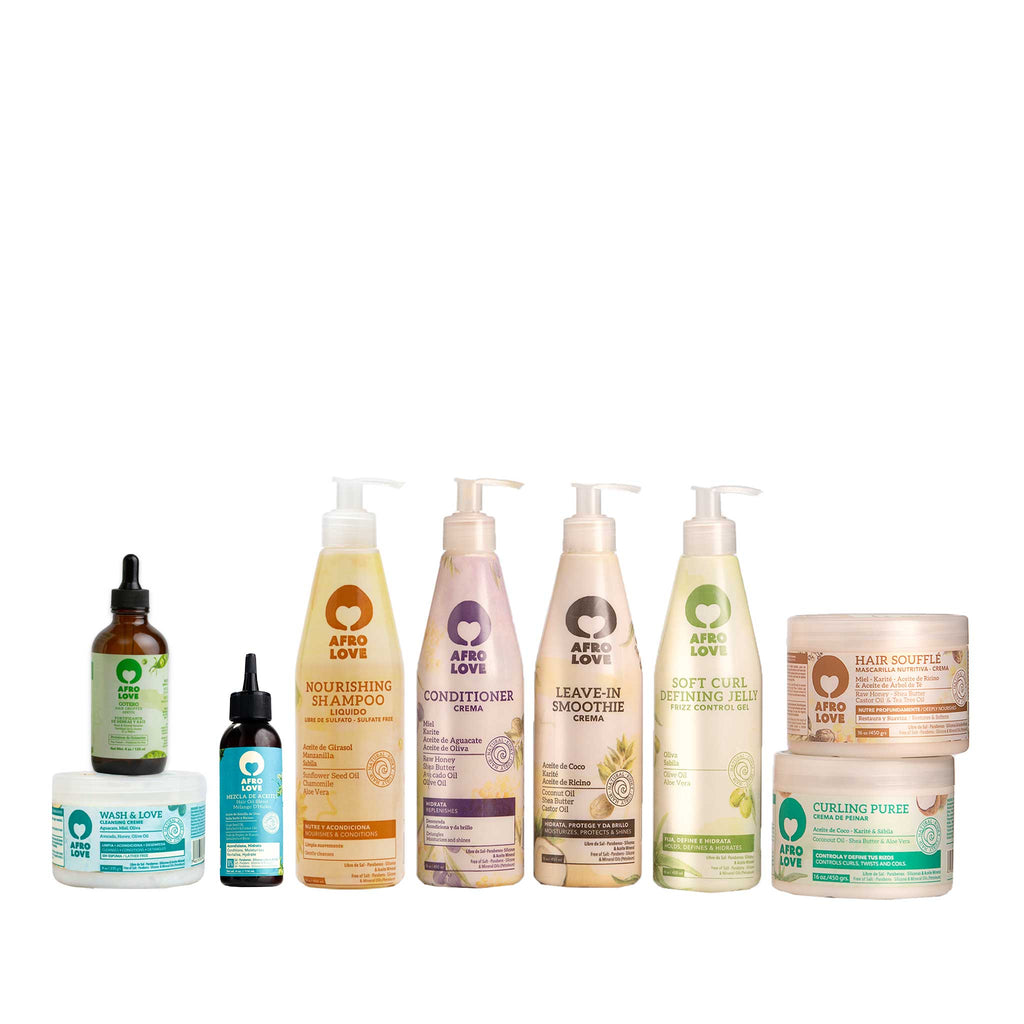 Afro Love es una línea capilar formulada libre de sales, sulfatos, parabenos, formol, dea, colorantes, aceites minerales y siliconas. Creada para cabellos naturales, afro o en transición. La línea conjuga una mezcla especial que estimula, refresca, hidrata, nutre y protege tu cabellera, aportándole brillo, definición y sedosidad a cada hebra.